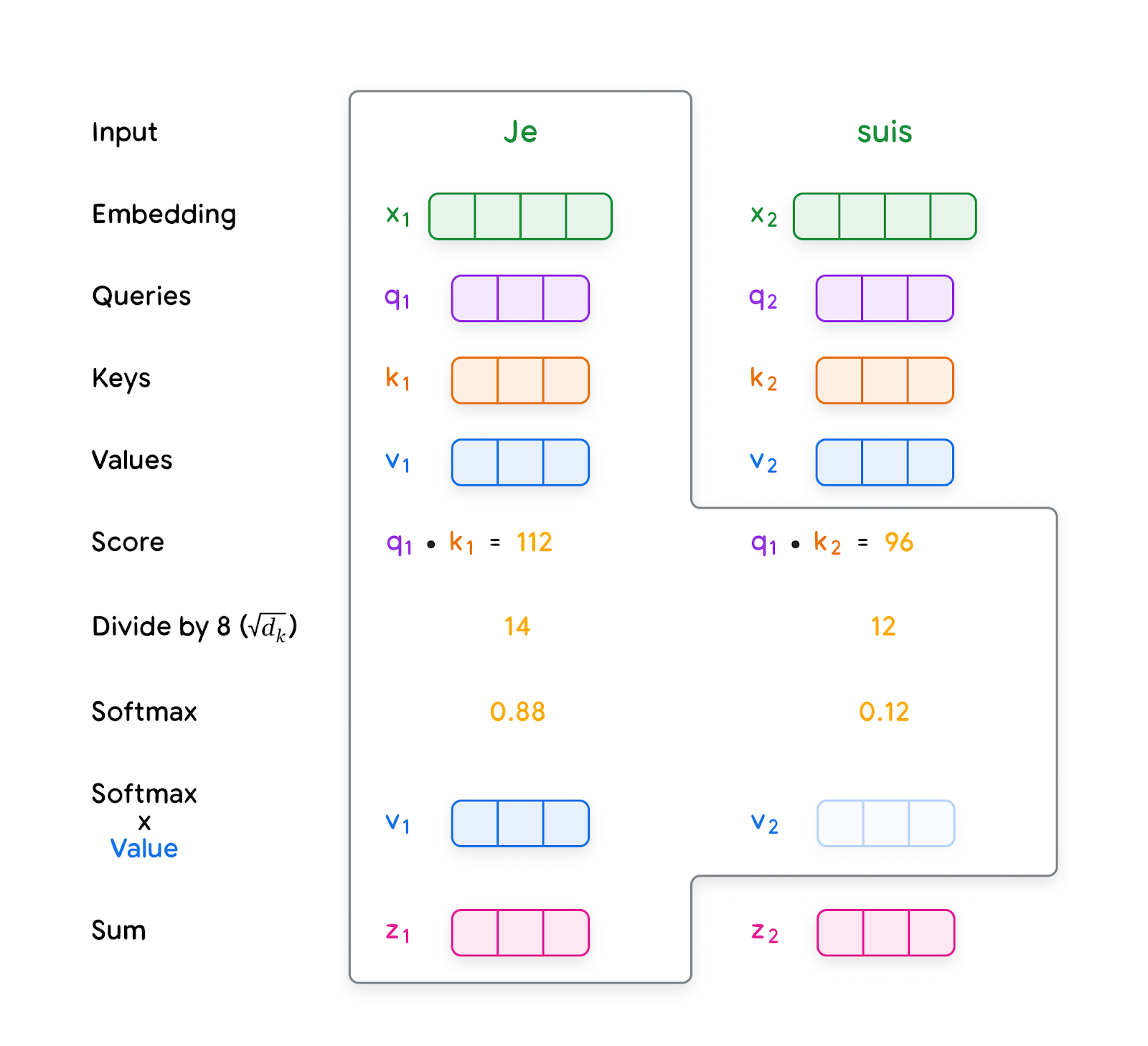 ์ฟผ๋ฆฌ(Query), ํค(Key), ๊ฐ(Value)์ ์์ฑํ๋ค. ์ ๋ ฅ ์๋ฒ ๋ฉ ๊ฐ๊ฐ์ ํ์ต๋ ๊ฐ์ค์น ํ๋ ฌ 3๊ฐ(Wq, Wk, Wv)์ ๊ณฑํ์ฌ Q, K, V ๋ฒกํฐ๋ฅผ ์์ฑํ๋ค. ์ด๋ค์ ๊ฐ ๋จ์ด์ ์ ๋ฌธํ๋ ํํ๊ณผ ์ ์ฌํ๋ค.