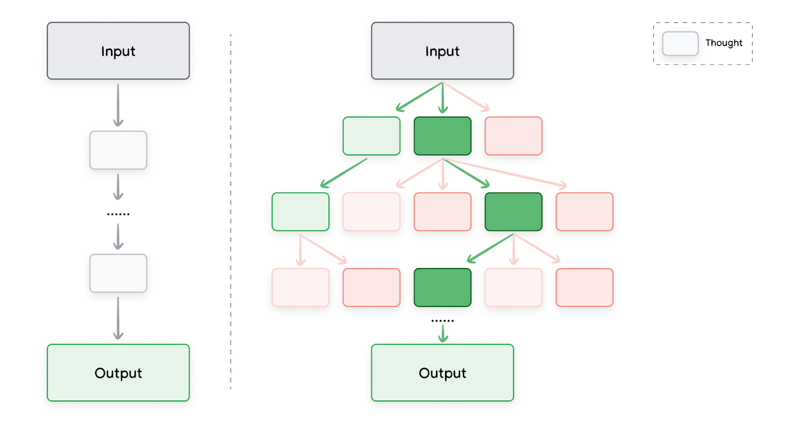 ToT๋ ๋จ์ํ ํ ์ค๋ก ์ด์ด์ง๋ ์ฌ๊ณ ๊ฒฝ๋ก(CoT) ๋์ , ๋ค์ํ ์ฌ๊ณ ๊ฒฝ๋ก๋ฅผ ๋์์ ํ์ํ ์ ์๋๋ก LLM์ ์ ๋ํ๋ค.