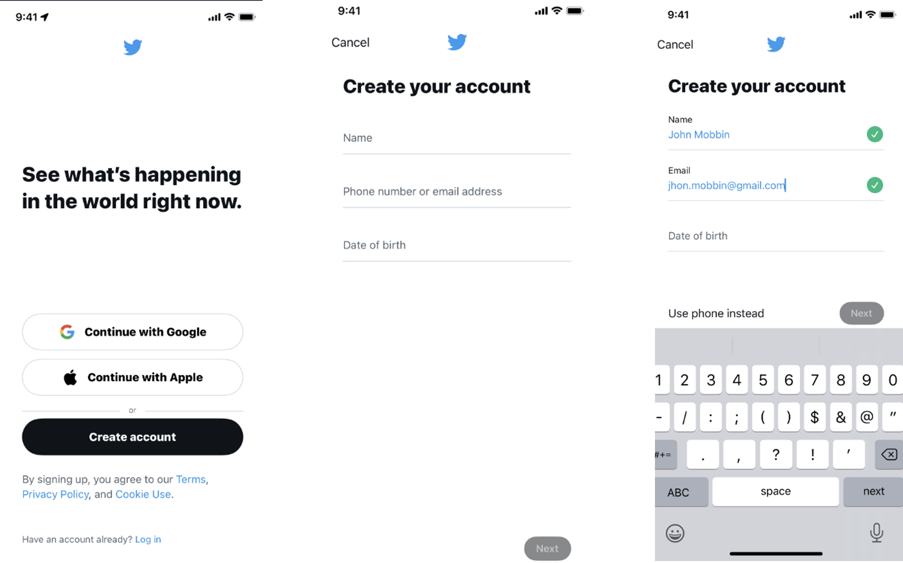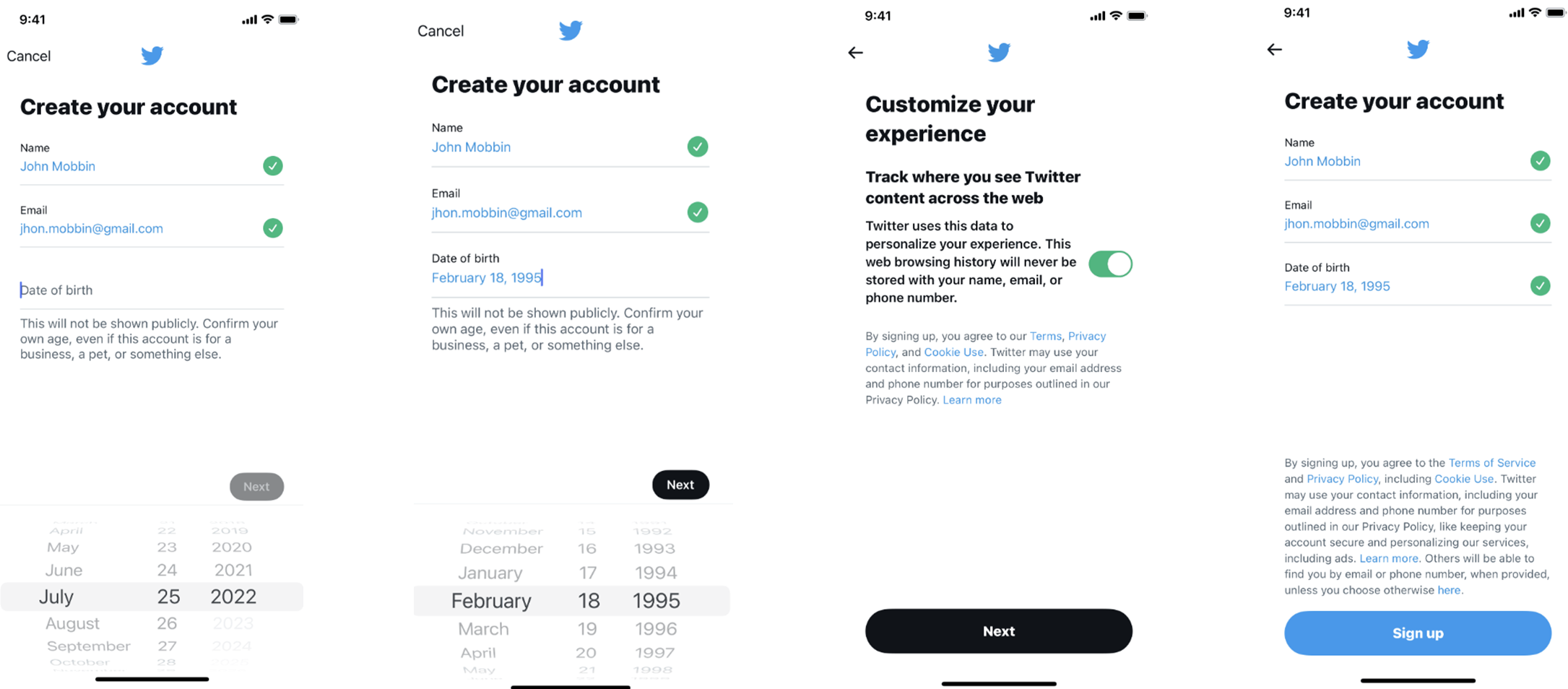- (2) Create Account Screen: “Customize Experience” screen. 이 화면에는 “이름”, “이메일” 및 “생년월일”을 입력하는 양식이 있습니다.