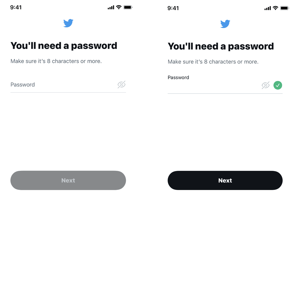 - 사용자가 비밀번호를 입력하면 입력 옆에 녹색 아이콘이 표시되고 “다음” 버튼이 활성화되어야 합니다.