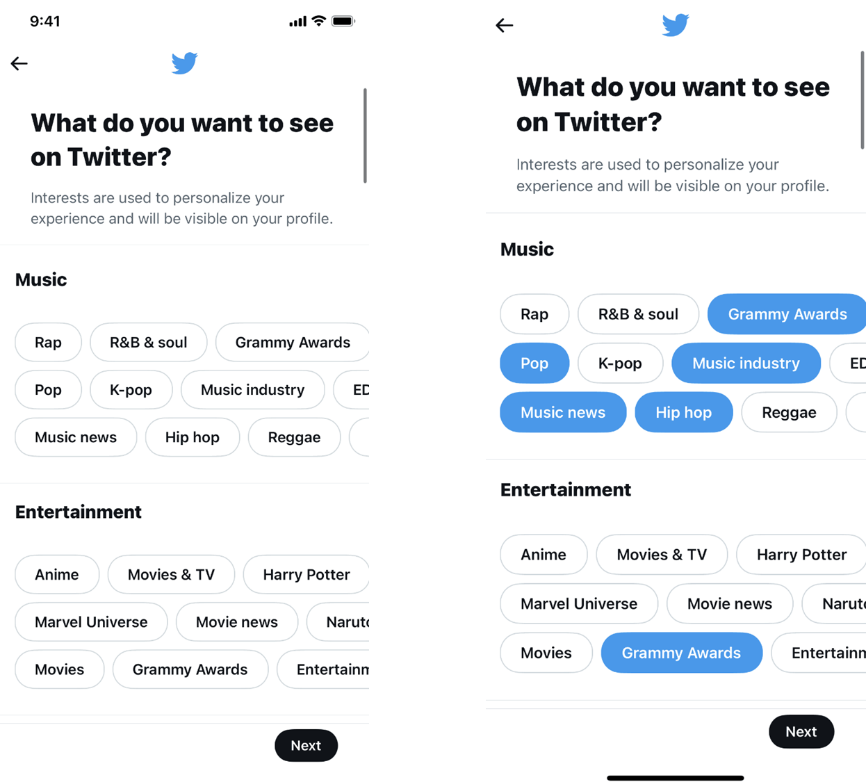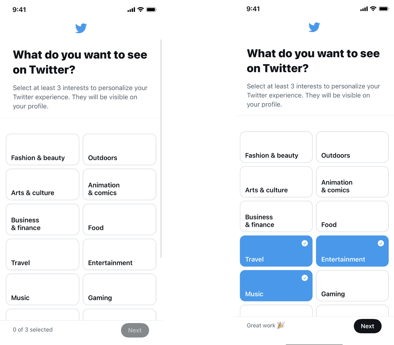 - 사용자가 “다음” 버튼을 활성화하려면 최소 3개의 관심사를 선택해야 합니다.